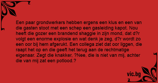 Een paar grondwerkers hebben ergens een klus en een van die gasten stoot met een schep een gasleiding kapot. Nou heeft die gozer een brandend shaggie in zijn mond, dat d?r volgt een enorme explosie en wat denk je zeg, d?r wordt zo een oor bij hem afgerukt. Een collega ziet dat oor liggen, die raapt het op en die geeft het terug aan de rechtmatige eigenaar. Zegt die knakker, ?Nee, die is niet van mij, achter die van mij zat een potlood.?
