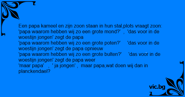 'papa waarom hebben wij zo een grote poten?' 'das voor in de woestijn jongen' zegt de papa opnieuw
