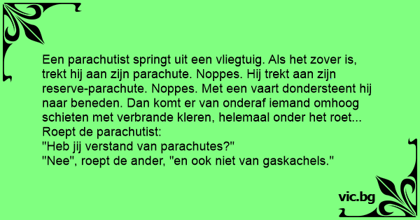 Een parachutist springt uit een vliegtuig. Als het zover is, trekt hij aan zijn parachute. Noppes. Hij trekt aan zijn reserve-parachute. Noppes. Met een vaart dondersteent hij naar beneden. Dan komt er van onderaf iemand omhoog schieten met verbrande kleren, helemaal onder het roet... Roept de parachutist: