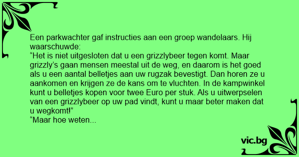 “Oh, geen probleem. Dat ziet u meteen. Uitwerpselen van de grizzly’s zitten namelijk vol met belletjes”.