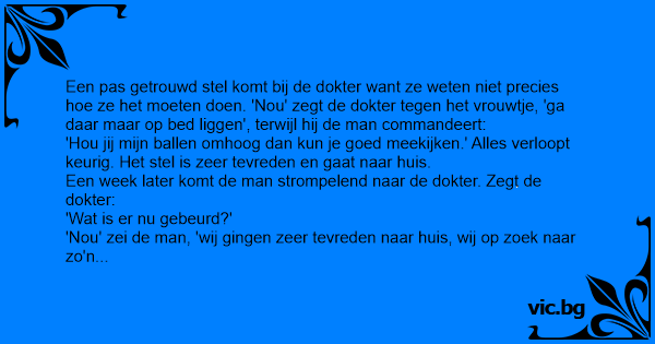 Een pas getrouwd stel komt bij de dokter want ze weten niet precies hое ze het moeten doen. 'Nou' zegt de dokter tegen het vrouwtje, 'ga daar maar op bed liggen', terwijl hij de man commandeert: