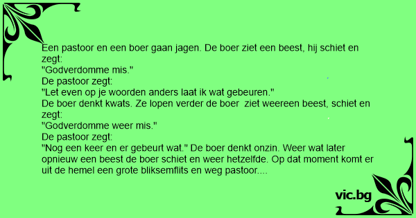 Een pastoor en een boer gaan jagen. De boer ziet een beest, hij schiet en zegt: