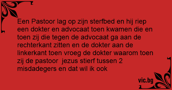 Een Pastoor lag op zijn sterfbed en hij riep een dokter en advocaat toen kwamen die en toen zij die tegen de advocaat ga aan de rechterkant zitten en de dokter aan de linkerkant toen vroeg de dokter waarom toen zij de pastoor jezus stierf tussen 2 misdadegers en dat wil ik ook