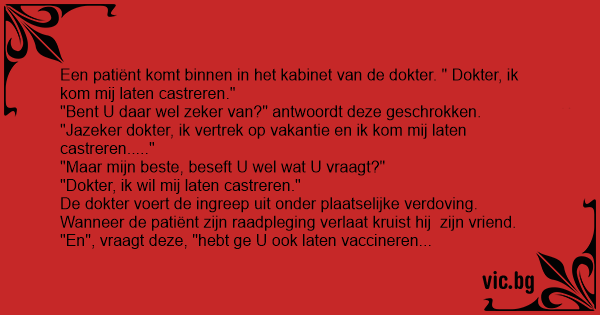 "Jazeker dokter, ik vertrek op vakantie en ik kom mij laten castreren....."