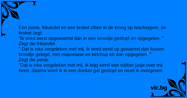 Een реnis, frikandel en een kroket zitten in de kroeg op tescheppen, de kroket zegt: