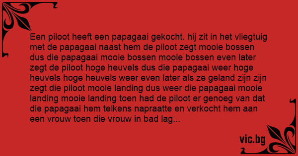 Een piloot heeft een papagaai gekocht. hij zit in het vliegtuig met de papagaai naast hem de piloot zegt mooie bossen dus die papagaai mooie bossen mooie bossen even later zegt de piloot hoge heuvels dus die papagaai weer hoge heuvels hoge heuvels weer even later als ze geland zijn zijn zegt die piloot mooie landing dus weer die papagaai mooie landing mooie landing toen had de piloot er genoeg van dat die papagaai hem telkens napraatte en verkocht hem aan een vrouw toen die vrouw in bad lag met de papagaai aan de badrand zei die papagaai mooie bossen mooie bossen dus die vrouw staat op en roept WAT en die papagaai zegt hoge heuvels hoge heuvels en die vrouw is zo boos dat ze uitgleid en die papagaai zegt: mooie landing mooie landing