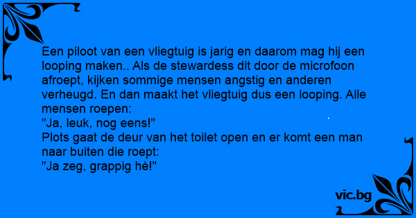 Een piloot van een vliegtuig is jarig en daarom mag hij een looping maken.. Als de stewardess dit door de microfoon afroept, kijken sommige mensen angstig en anderen verheugd. En dan maakt het vliegtuig dus een looping. Alle mensen roepen: