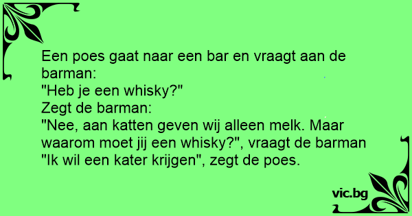 "Nee, aan katten geven wij alleen melk. Maar waarom moet jij een whisky?", vraagt de barman "Ik wil een kater krijgen", zegt de роеs.