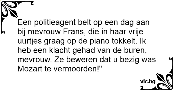 Een politieagent belt op een dag aan bij mevrouw Frans, die in haar vrije uurtjes graag op de piano tokkelt. Ik heb een klacht gehad van de buren, mevrouw. Ze beweren dat u bezig was Mozart te vermoorden!"