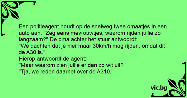 Een politieagent houdt op de snelweg twee omaatjes in een auto aan. "Zeg eens mevrouwtjes, waarom rijden jullie zo langzaam?" De oma achter het stuur antwoordt: