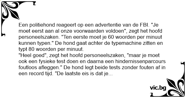 Een politiehond reageert op een advertentie van de FBI. "Je moet eerst aan al onze voorwaarden voldoen", zegt het hoofd personeelszaken. "Ten eerste moet je 60 woorden per minuut kunnen typen." De hond gaat achter de typemachine zitten en typt 80 woorden per minuut.