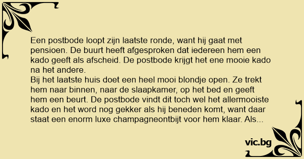 Bij het laatste huis doet een heel mooi blondje open. Ze trekt hem naar binnen, naar de slaapkamer, op het bed en geeft hem een beurt. De postbode vindt dit toch wel het allermooiste kado en het word nog gekker als hij beneden komt, want daar staat een enorm luxe champagneontbijt voor hem klaar. Als hij uitgegeten is, bedankt hij het blondje uitvoerig voor de aangename verrassing en zij zegt dat er nog één ding is, het ligt naast zijn bord. Het is een gulden.