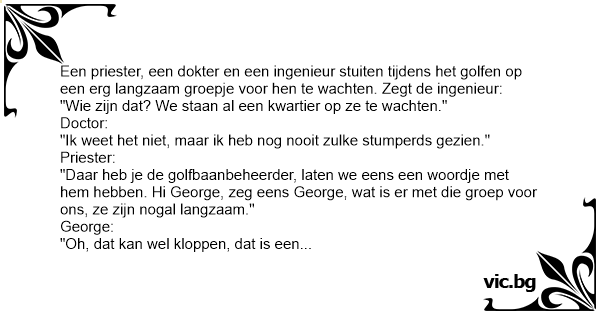 Een priester, een dokter en een ingenieur stuiten tijdens het golfen op een erg langzaam groepje voor hen te wachten. Zegt de ingenieur: