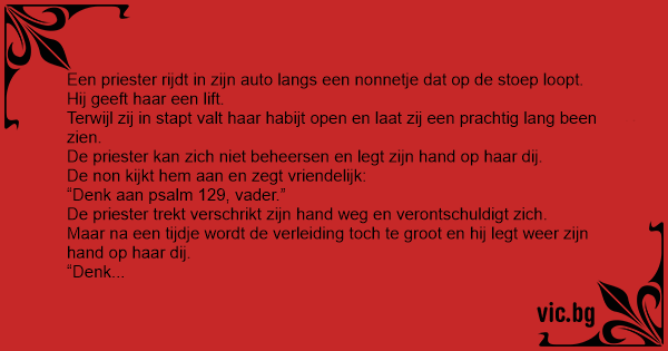 Der Pfarrer ist mit einer Nonne unterwegs zu einer Veranstaltung, er fährt und sie sitzt daneben. Er merkt, dass die junge Nonne eigentlich ziemlich attraktiv ist und so wandert seine Hand...