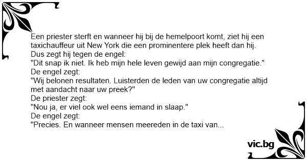 En präst och en taxi förare dog och de båda kom upp till himlen samtidigt. Sankte Per stod vid pärleporten och väntade på dem. - Följ med mig! Sa sankte Per till taxi föraren. Taxi föraren gjorde som han blev tillsagd och följde med sankte Per till en stor herrgård. Herrgården hade all lyx som...