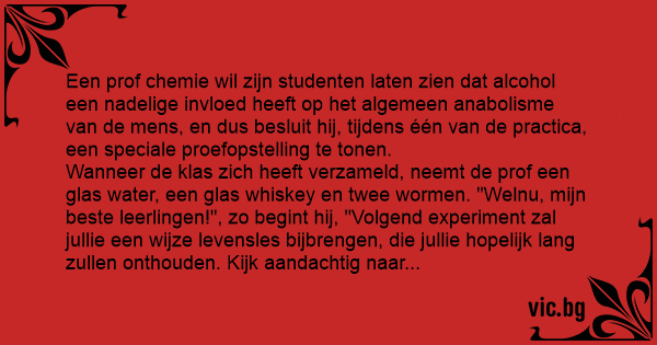 Wanneer de klas zich heeft verzameld, neemt de prof een glas water, een glas whiskey en twee wormen. "Welnu, mijn beste leerlingen!", zo begint hij, "Volgend experiment zal jullie een wijze levensles bijbrengen, die jullie hopelijk lang zullen onthouden. Kijk aandachtig naar volgende twee wormen..."