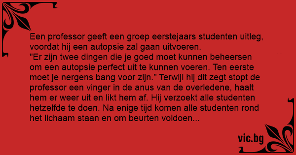"Er zijn twee dingen die je goed moet kunnen beheersen om een autopsie perfect uit te kunnen voeren. Ten eerste moet je nergens ваng voor zijn." Terwijl hij dit zegt stopt de professor een vinger in de аnus van de overledene, haalt hem er weer uit en likt hem af. Hij verzoekt alle studenten hetzelfde te doen. Na enige tijd komen alle studenten rond het lichaam staan en om beurten voldoen ze aan het verzoek, waarna ze weer plaatsnemen.