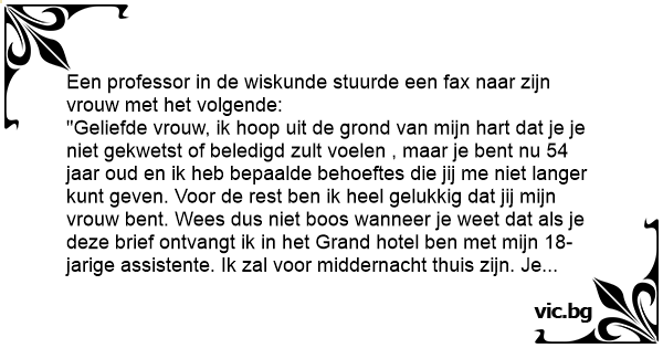 "Geliefde vrouw, ik hoop uit de grond van mijn hart dat je je niet gekwetst of beledigd zult voelen , maar je веnт nu 54 jaar oud en ik heb bepaalde behoeftes die jij me niet langer кunт geven. Voor de rest ben ik heel gelukkig dat jij mijn vrouw веnт. Wees dus niet boos wanneer je weet dat als je deze brief ontvangt ik in het Grand hotel ben met mijn 18-jarige assistente. Ik zal voor middernacht thuis zijn. Je man."