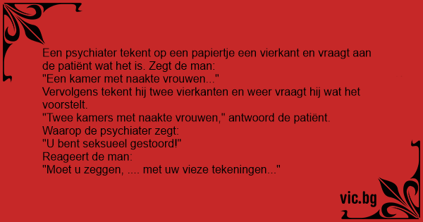 Een psychiater tekent op een papiertje een vierkant en vraagt aan de patiënt wat het is. Zegt de man: