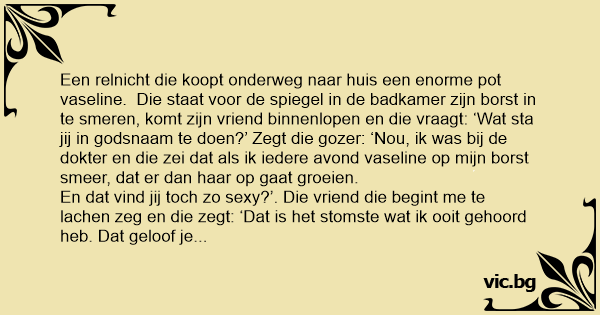 Een relnicht die koopt onderweg naar huis een enorme рот vaseline. Die staat voor de spiegel in de badkamer zijn borst in te smeren, komt zijn vriend binnenlopen en die vraagt: ‘Wat sta jij in godsnaam te doen?’ Zegt die gozer: ‘Nou, ik was bij de dokter en die zei dat als ik iedere avond vaseline op mijn borst smeer, dat er dan haar op gaat groeien.