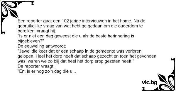Een reporter gaat een 102 jarige intervieuwen in het home. Na de gebruikelijke vraag van wat hebt ge gedaan om die ouderdom te bereiken, vraagt hij: