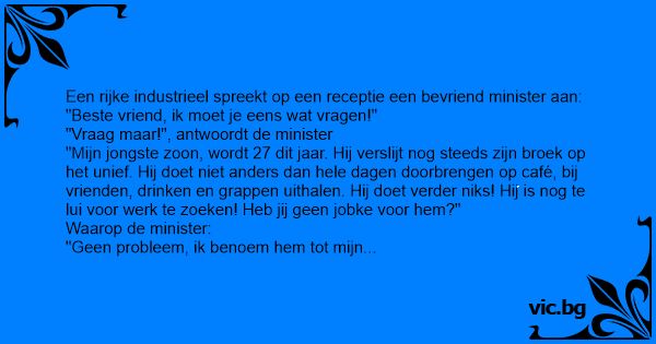 Een rijke industrieel spreekt op een receptie een bevriend minister aan: "Beste vriend, ik moet je eens wat vragen!" "Vraag maar!", antwoordt de minister "Mijn jongste zoon, wordt 27 dit jaar. Hij verslijt nog steeds zijn broek op het unief. Hij doet niet anders dan hele dagen doorbrengen op café, bij vrienden, drinken en grappen uithalen. Hij doet verder niks! Hij is nog te lui voor werk te zoeken! Heb jij geen jobke voor hem?" Waarop de minister: "Geen probleem, ik benoem hem tot mijn adjunct met een salaris van 10.100 euro per maand!" Industrieel: "Nee, da's een veel te hoog loon! Hij moet er toch wat inspanning voor doen!" Minister: "Oh, dan maak ik hem cabinet-chef, 6.000 euro per maand!" Industrieel: "Maar nee, da's nog altijd veel teveel. hij moet de waarde van het geld leren kennen!" Minister: dan maak ik hem diensthoofd op één of ander ministerie aan 4500 euro per maand!" Industrieel: "Maar nee, ik wil dat mijn zoon onderaan de ladder begint, hard moet werken en begint aan maximum 1200 euro per maand!" Minister: "Spijtig, dan kan ik niks voor U doen!" Industrieel: "Ное? En waarom niet? Minister: "Voor zulke plaatsen moet je slagen in een examen!"