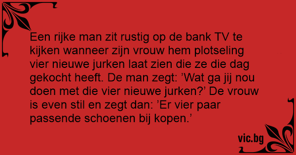 Een rijke man zit rustig op de bank TV te kijken wanneer zijn vrouw hem plotseling vier nieuwe jurken laat zien die ze die dag gekocht heeft. De man zegt: ’Wat ga jij nou doen met die vier nieuwe jurken?’ De vrouw is even stil en zegt dan: ’Er vier paar passende schoenen bij kopen.’