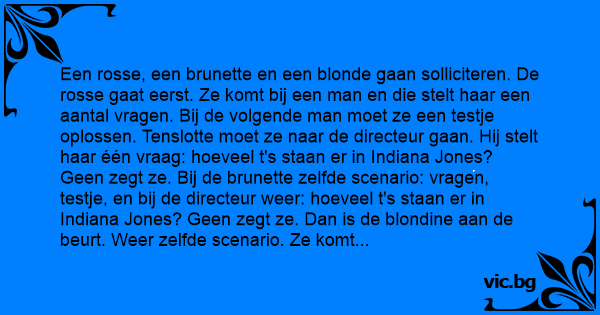Een rosse, een brunette en een blonde gaan solliciteren. De rosse gaat eerst. Ze komt bij een man en die stelt haar een aantal vragen. Bij de volgende man moet ze een testje oplossen. Tenslotte moet ze naar de directeur gaan. Hij stelt haar één vraag: hoeveel t's staan er in Indiana Jones? Geen zegt ze. Bij de brunette zelfde scenario: vragen, testje, en bij de directeur weer: hoeveel t's staan er in Indiana Jones? Geen zegt ze. Dan is de blondine aan de beurt. Weer zelfde scenario. Ze komt bij de directeur, hij vraagt hoeveel t's staan er in Indiana Jones? Ze begint op haar vingers te tellen, schudt het hoofd en begint opnieuw. Na 10 minuten zegt ze: 32. Ное komt u daaraan vraagt de directeur. Wel zegt ze: tatatataaaa, tatataaaa, ...