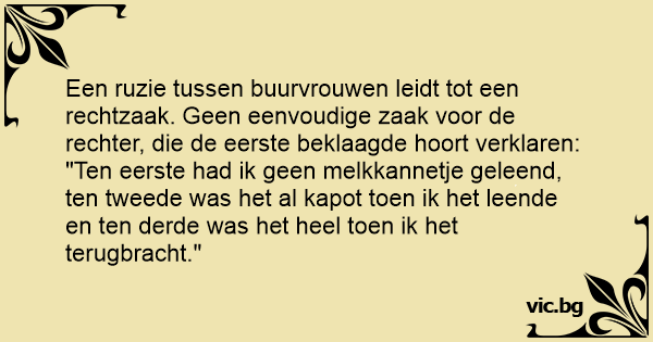 "Ten eerste had ik geen melkkannetje geleend, ten tweede was het al kapot toen ik het leende en ten derde was het heel toen ik het terugbracht."