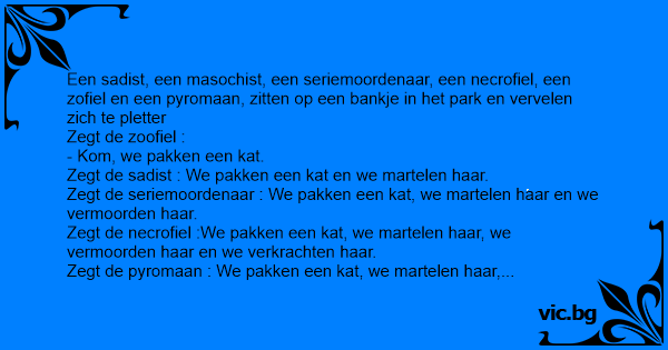 C'est un sadique, un tueur en série, un masochiste, un pyromane et un nécrophile qui sont dans un parc. (Déjà l'histoire commence bien) Le sadique, qui s'ennuie, dit : "Venez on torture un chat !"...