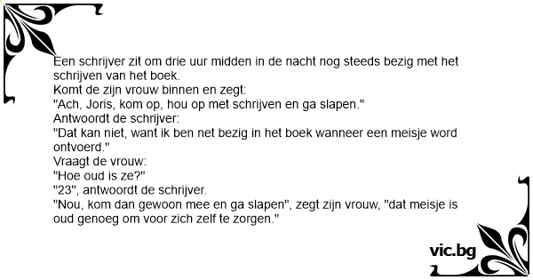 "Nou, kom dan gewoon mee en ga slapen", zegt zijn vrouw, "dat meisje is oud genoeg om voor zich zelf te zorgen."