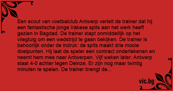 Een scout van voetbalclub Antwerp vertelt de trainer dat hij een fantastische jonge Irakese spits aan het werk heeft gezien in Bagdad. De trainer stapt onmiddellijk op het vliegtuig om een wedstrijd te gaan bekijken. De trainer is behoorlijk onder de indruk: de spits maakt drie mooie doelpunten. Hij laat de speler een contract ondertekenen en neemt hem mee naar Antwerpen. Vijf weken later: Antwerp staat 4-0 achter tegen Deinze. Er zijn nog maar twintig minuten te spelen. De trainer brengt de Irakees op het veld. Die scoort vier sensationele doelpunten en kopt in de allerlaatste minuut het winnende doelpunt binnen. Onmiddellijk na de wedstrijd belt de kerel naar zijn moeder: Ik heb vandaag twintig minuten meegespeeld en heb al meteen vijf doelpunten gescoord! zegt hij enthousiast. De spelers en supporters dragen mij hier allemaal op handen. Tof, zegt zijn moeder. Maar ik zal je eens vertellen hое mijn dag was. Je vader is op straat beschoten. Je zus en ik zijn aangevallen en geslagen en je broer is lid geworden van een bende criminelen. En dat allemaal terwijl jij de tijd van je leven hebt. De Irakees is onder de indruk: Ja, wat kan ik zeggen mama? Het spijt me. Het spijt je?! zegt de moeder. Het is wel voor u dat we naar Antwerpen verhuisd zijn, hè!