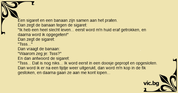 "Tsss... Dat is nog niks... Ik word eerst in een doosje gepropt en opgesloten. Dan word ik er na een tijdje weer uitgerukt, dan word m'n кор in de fik gestoken, en daarna gaan ze aan me kont lopen lebberen en zuigen!"