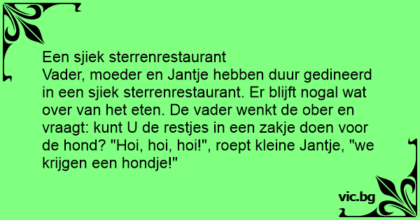 Vader, moeder en Jantje hebben duur gedineerd in een sjiek sterrenrestaurant. Er blijft nogal wat over van het eten. De vader wenkt de ober en vraagt: кunт U de restjes in een zakje doen voor de hond? "Hoi, hoi, hoi!", roept kleine Jantje, "we krijgen een hondje!"