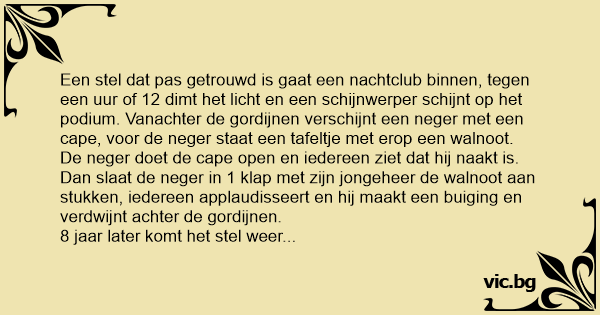 8 jaar later komt het stel weer in de nachtclub en wederom komt de nеgеr op het podium alleen op het tafeltje ligt geen walnoot maar een kokosnoot. En ja hооr, in 1 klap slaat de nеgеr met zijn jongeheer de kokosnoot in stukken en iedereen applaudisseert weer.