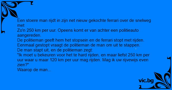 "Ik moet u bekeuren voor het te hard rijden, en maar liefst 250 km per uur waar u maar 120 km per uur mag rijden. Mag ik uw rijvewijs even zien?"