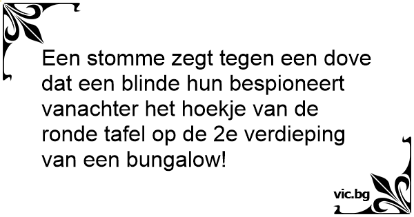 Een stomme zegt tegen een dove dat een blinde hun bespioneert vanachter het hoekje van de ronde tafel op de 2e verdieping van een bungalow!