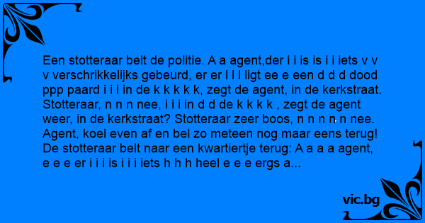 Een stotteraar belt de politie. A a agent,der i i is is i i iets v v v verschrikkelijks gebeurd, er er l l l ligt ee e een d d d dood ppp paard i i i in de k k k k k, zegt de agent, in de kerkstraat. Stotteraar, n n n nee, i i i in d d de k k k k , zegt de agent weer, in de kerkstraat? Stotteraar zeer boos, n n n n n nee. Agent, koel even af en bel zo meteen nog maar eens terug! De stotteraar belt naar een kwartiertje terug: A a a a agent, e e e er i i i is i i i iets h h h heel e e e ergs a a aan d d de h h hand. E e e er l l l ligt e e e een d d d d dood p p p paard i i i in d d d de k k k k k, Kerkstraat vraagt de agent? N n n nee, i i i in d d d de k k k k, Kerkstraat vraagt de agent weer? N n n n n nee zegt de stotteraar weer agressiever. Bel straks nog een keer terug zegt de agent kwaad.