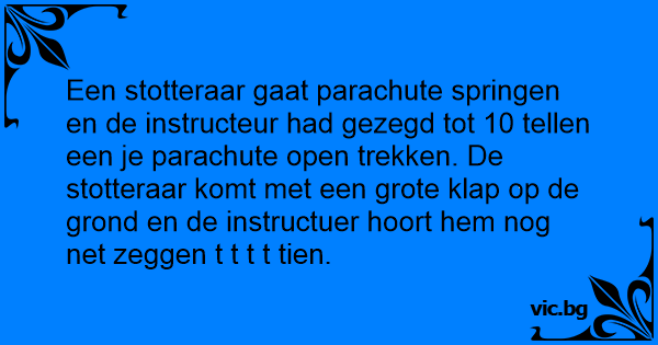 Een stotteraar gaat parachute springen en de instructeur had gezegd tot 10 tellen een je parachute open trekken. De stotteraar komt met een grote klap op de grond en de instructuer hoort hem nog net zeggen t t t t tien.