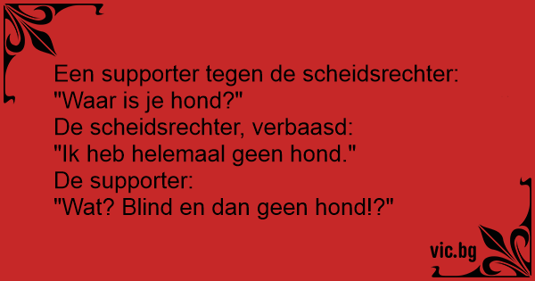 "Hoe heet uw hond?" vraagt de doelman aan de scheidsrechter."Ik heb helemaal geen hond." "Wat verschrikkelijk! Blind en toch geen hond!"