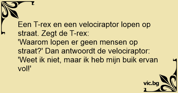 Een T-rex en een velociraptor lopen op straat. Zegt de T-rex: