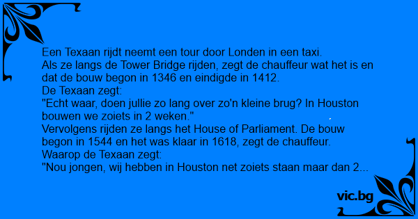 Als ze langs de Tower Bridge rijden, zegt de chauffeur wat het is en dat de bouw begon in 1346 en eindigde in 1412.