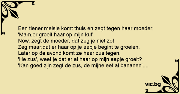 Truusje komt aanlopen en zegt tegen haar moeder “Mam, ik krijg al een beetje haar op mijn kutje” Haar moeder schrikt op en zegt: “Truusje, dan mag je niet meer zeggen met die woorden. Je moet dan...