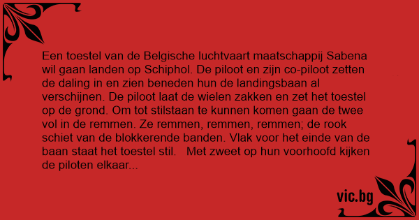Een toestel van de Belgische luchtvaart maatschappij Sabena wil gaan landen op Schiphol. De piloot en zijn co-piloot zetten de daling in en zien beneden hun de landingsbaan al verschijnen. De piloot laat de wielen zakken en zet het toestel op de grond. Om tot stilstaan te kunnen komen gaan de twee vol in de remmen. Ze remmen, remmen, remmen; de rook schiet van de blokkerende banden. Vlak voor het einde van de baan staat het toestel stil. Met zweet op hun voorhoofd kijken de piloten elkaar aan. Zegt de een tegen de ander: