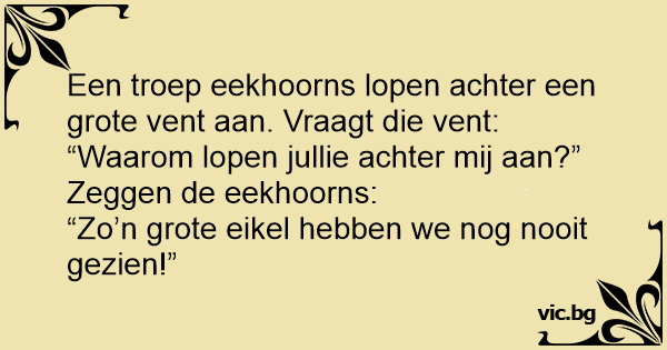 Een troep eekhoorns lopen achter een grote vent aan. Vraagt die vent: