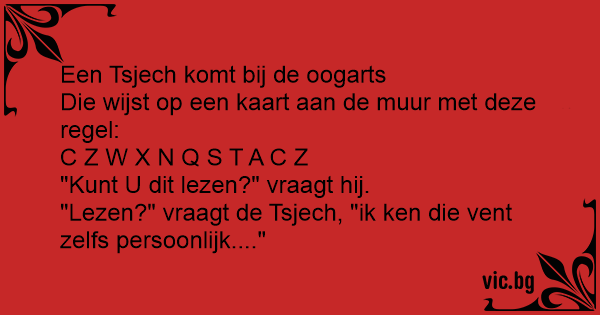 Čehs aiziet pie acu ārsta. Ārsts noliek viņam priekšā tāfeli ar burtiem "C Z W X N Q Y S T A C Z" un jautā: "Vai varat izlasīt?" "Izlasīt?", čehs pārsteigts izsaucas. "O, es taču pazīstu šo puisi!"