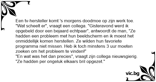 "Wat scheelt er", vraagt een collega. "Gisteravond werd ik opgebeld door een bejaard echtpaar", antwoordt de man, "Ze hadden een probleem met hun beeldscherm en ik moest het onmiddellijk komen herstellen. Ze wilden hun favoriete programma niet missen. Heb ik toch minstens 3 uur moeten zoeken om het probleem te vinden!"