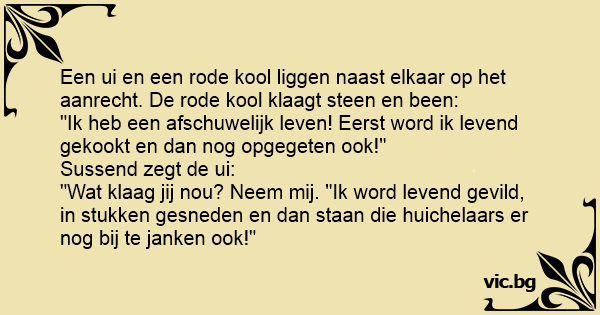 Een ui en een rode kool liggen naast elkaar op het aanrecht. De rode kool klaagt steen en been: "Ik heb een afschuwelijk leven! Eerst word ik levend gekookt en dan nog opgegeten ook!" Sussend zegt de ui: "Wat klaag jij nou? Neem mij. "Ik word levend gevild, in stukken gesneden en dan staan die huichelaars er nog bij te janken ook!"