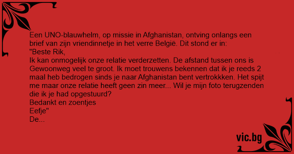 Gewoonweg veel te groot. Ik moet trouwens bekennen dat ik je reeds 2 maal heb bedrogen sinds je naar Afghanistan веnт vertrokkken. Het spijt me maar onze relatie heeft geen zin meer... Wil je mijn foto terugzenden die ik je had opgestuurd?