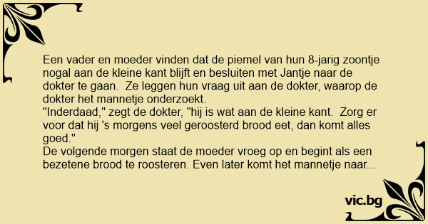 "Inderdaad," zegt de dokter, "hij is wat aan de kleine kant. Zorg er voor dat hij 's morgens veel geroosterd brood eet, dan komt alles goed."